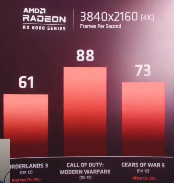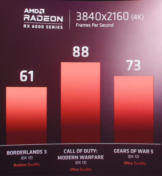 На презентации были озвучены результаты тестирования системы на базе AMD Ryzen 7 5900X и Radeon RX 6000 в трех современных и требовательных играх с максимальными настройками графики и разрешении 4K. В качестве игр были выбраны Borderlands 3 (Badass качество), Call of Duty: Modern Warfare и Gears of War 5 (Ultra качество). Все игры использовали графический API DirectX 12.