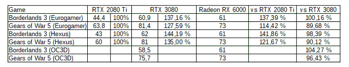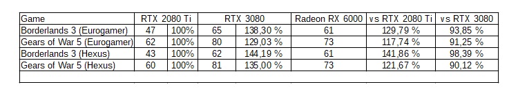 Немецкий портал Planet 3DNow! в своем twitter @planet3dnow уже опубликовал сравнительную таблицу производительности двух поколений видеокарт NVIDIA GeForce и AMD Radeon RX 6000. В соответствии с ней, вариант AMD уступает RTX 3080 до 10%. Но это очень пессимистичная оценка. Например, в тестировании портала thinkcomputers RTX 3080 в Borderlands 3 показала тот же результат — 61 FPS, аналогичная ситуация в тестировании hardwareunboxed, где RTX 3080 показала в Gears of War 5 около 72 FPS. Поэтому можно считать, что AMD удалось создать аналог RTX 3080, однако остается неизвестной производительность в трассировке лучей — ждем следующей конференции, которая состоится 28 октября.