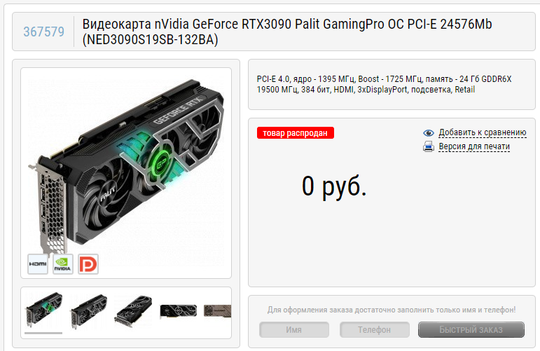 То, что случилось сегодня можно смело назвать чудом. Посудите сами, внезапно в Регарде появилась новая видеокарта GeForce RTX 3090 производства Palit, принадлежащая к серии GamingPro. Мы не знаем, сколько точно единиц было доступно для заказа, но цена оказалась довольно суровой: 167 100 рублей. Это без малого 2 140 долларов, что почти на 500 долларов больше, чем официальная стоимость данной модели. На самом деле сейчас никто не знает, что такое официальная цена, ведь даже партнёр MSI был замечен в перепродаже видеокарт GeForce RTX 3080 на Ebay.