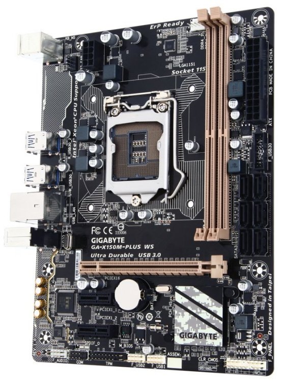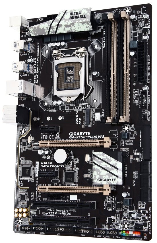 Эти материнские платы предназначены для процессоров Xeon E3-1200 v3 и базируются на чипсетах C232 и C236. Из всей линейки сайт TechReport выделил две модели, первой из которых стала GA-X150-PLUS WS. Она снабжена двумя слотами PCI Express x16 для видеокарт, портом M.2, использующим четыре линии PCI Express, контроллером Intel Gigabit NIC, продвинутой аудиоподсистемой с функцией Audio Noise Guard и даже светодиодной подсветкой.