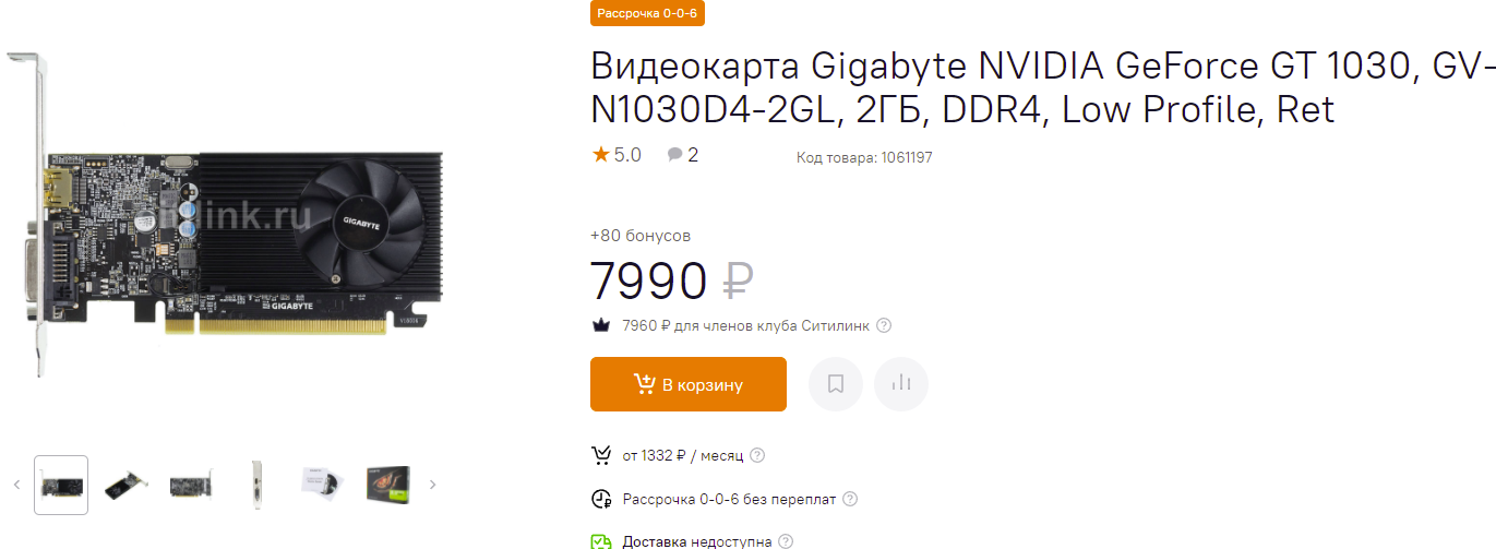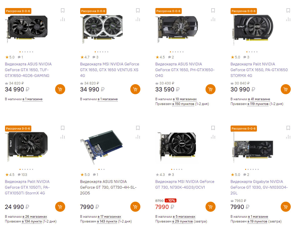 Ниже вы можете увидеть всё, что стоит дешевле 35 тысяч рублей и дороже 8 тысяч. Да, это всего 8 моделей, а значит выбор настолько ограничен, что найти недорогую видеокарту стало ещё сложнее. Наиболее бюджетной остаётся GeForce GT 1030. Играть на ней в новые тайтлы невозможно, а вот старые проекты и нетребовательные онлайн-шутеры или ММОРПГ данная модель всё ещё тянет. Если вам кажется, что 8000 рублей для такой карты – это слишком много, то вы не одиноки, вот только выбора практически нет, поэтому стоит поторопиться.