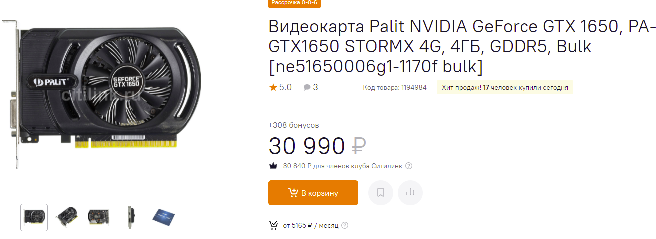 Неплохо берут и GeForce GTX 1650. 17 человек решили, что стоит переплатить 6 тысяч рублей. Нужно признать, что такое решение было абсолютно верным, ведь GeForce GTX 1050 Ti примерно на 30% медленнее GeForce GTX 1650, а значит вы получите более красивую графику, средние и высокие настройки качества и небольшой запас прочности.