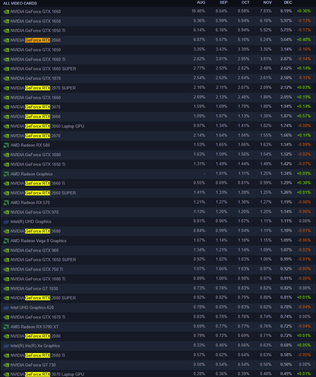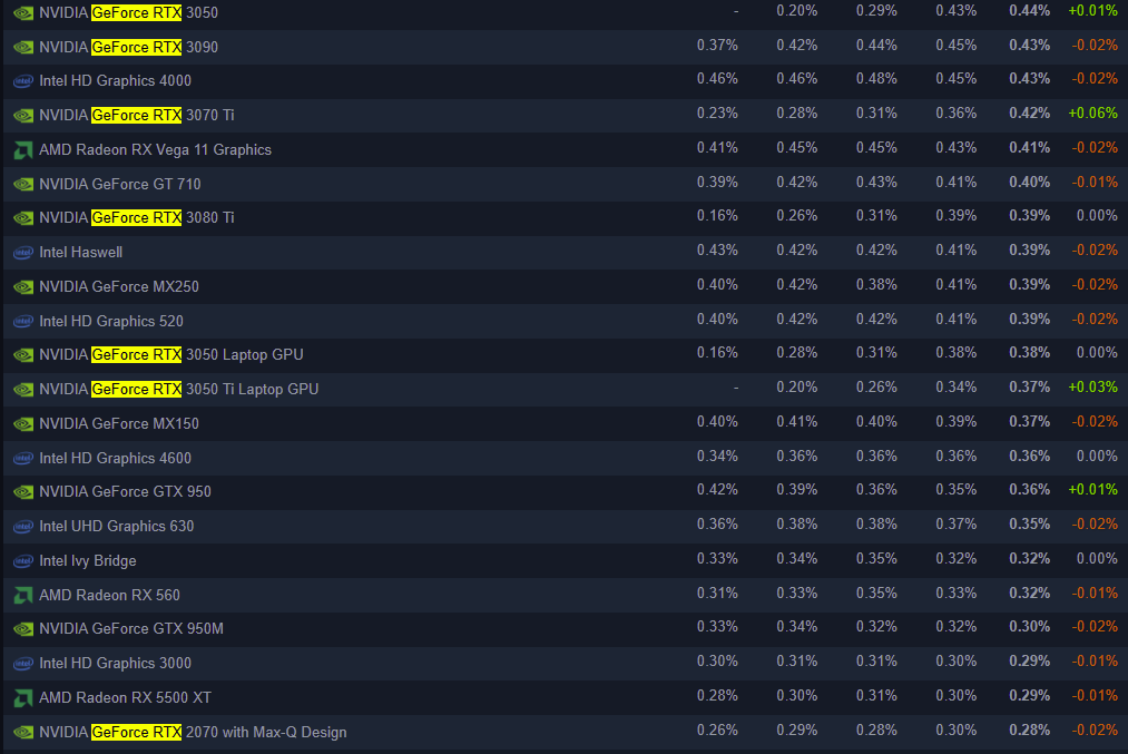 Мы прибавили все вышедшие видеокарты NVIDIA Ampere, включая мобильные версии, которые можно найти в списке 100 наиболее популярных моделей Steam. Вы удивитесь, но серия GeForce RTX 3000 находится на руках у 8.97% геймеров. Что до серии GeForce RTX 2000, то здесь показатель доходит до 12.98%. Если не верите, вот ссылка, пересчитайте. Получается, что последние серии заинтересовали всего 22% геймеров.
