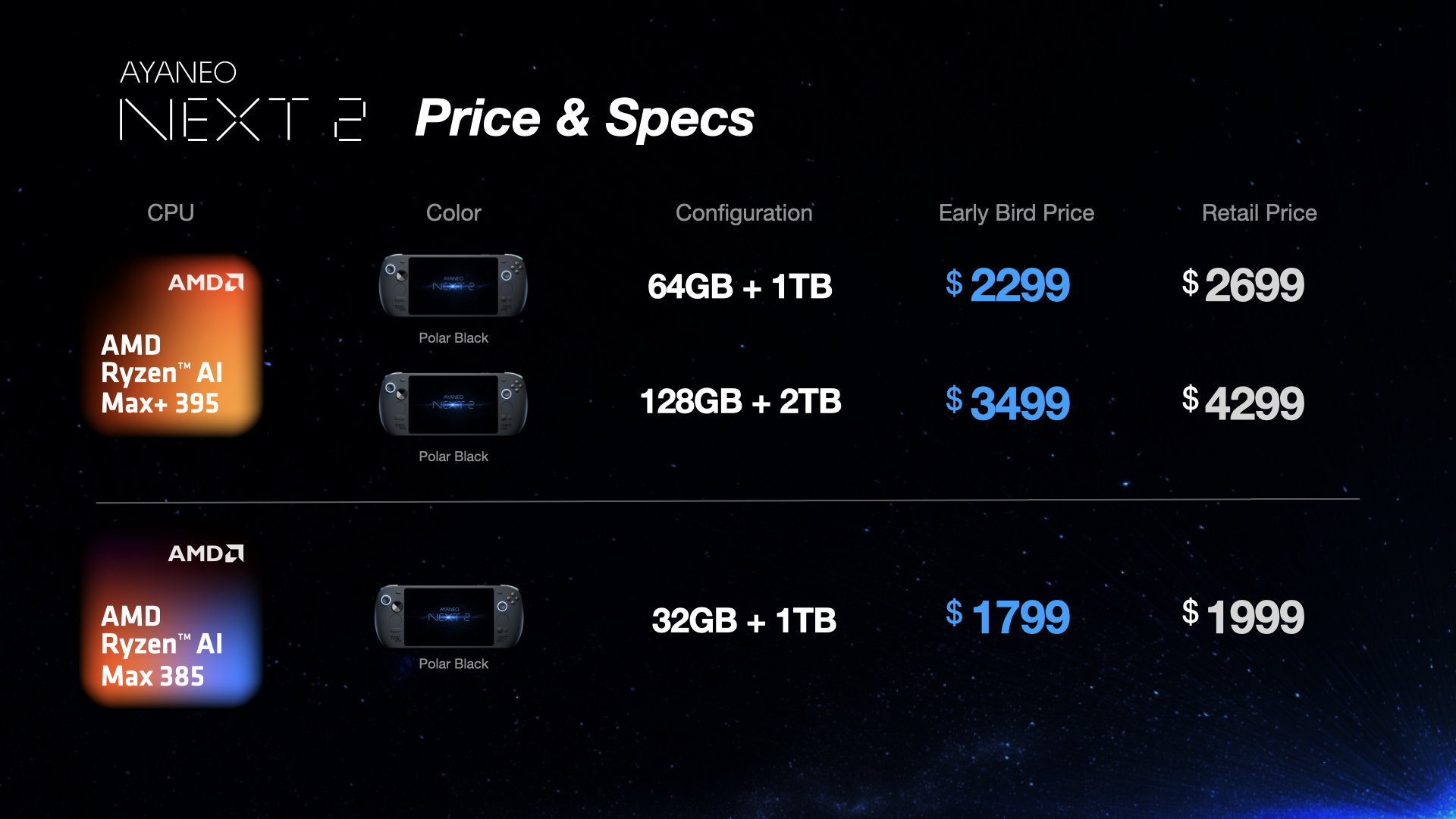 Игровое устройство Ayaneo Next 2 будет продаваться в трёх конфигурациях с процессорами AMD Ryzen AI Max+ 395 и Ryzen AI Max 385. Невероятно высокие цены производитель оправдывает текущей непростой ситуаций на рынке памяти, поэтому даже базовая версия обойдётся в $1799. Такой вариант снабдят чипом Ryzen AI Max 385, а также 32 Гбайт оперативной памяти и 1 Тбайт памяти накопителя. Причём, заявленная цена будет актуальной только для первых покупателей, поскольку позже её поднимут до $1999. Вариант с более быстрым процессором Ryzen AI Max+ 395 в цвете Polar Black будет продаваться в двух комплектациях, где ценники для первых покупателей тоже будут несколько снижены.