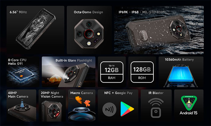 Дополнительные функции смартфона включают два динамика, NFC, инфракрасный порт, трёхдиапазонный BeiDou и двухчастотный GPS. Телефон также будет иметь степень защиты от воды и пыли по стандарту IP69. Корпус смартфона является пластиковым, его толщина составляет 7,76 мм, а масса — 193 грамма. Некоторые варианты телефона будут иметь толщину и массу 7,96 мм и 199 граммов соответственно.