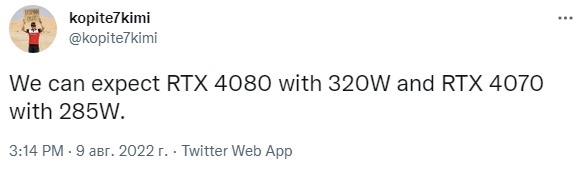 Известный инсайдер @kopite7kimi сообщил о новых значениях энергопотребления будущих видеокарт RTX 4080 и RTX 4070. Мощность RTX 4070 немного снизилась до 285 Вт с ранее прогнозируемых 300 Вт, в то время как целевое энергопотребление RTX 4080 упало до 320 Вт, что соответствует RTX 3080. Предыдущие слухи предполагали, что её энергопотребление может достигать 450 Вт.