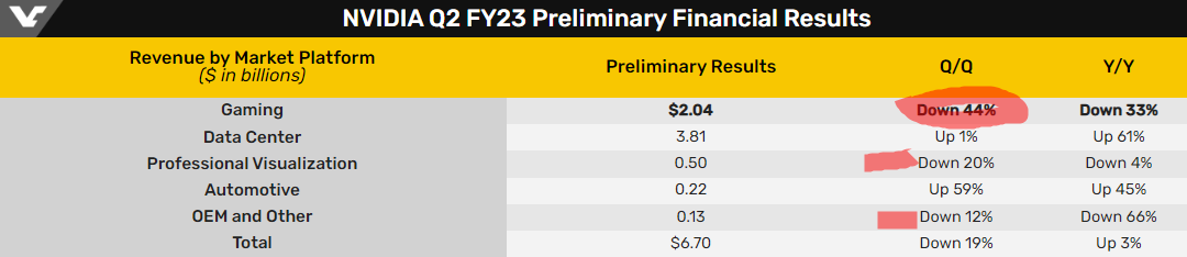 Финансовые показатели Nvidia на 2022 год выглядит не очень хорошо. В недавнем предварительном отчете о финансовых результатах компания объявила о колоссальных 44% ежеквартальных потерях доходов от игр. Общий доход снизился с 8,1 млрд долларов до 6,7 млрд долларов, а доход от игр упал с 2,04 млрд долларов до 3,64 млрд долларов.