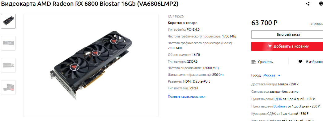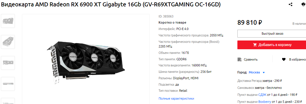 За 64 тысяч можно купить Radeon RX 6800. Здесь нет такой ультимативной скорости, как у флагмана красной команды, но и цена на 25 тысяч рублей ниже. Возможно, если у вас карманы переполнены пятитысячными купюрами, то стоит присмотреться к более быстрой видеокарте, для всех остальных Radeon RX 6800 окажется разумным выбором. Модель производства Gigabyte традиционно радует эффективной системой охлаждения, а продуманное программное обеспечение включает вертушки только тогда, когда это действительно нужно. Ну и не забывайте о наличии 16 Гб видеопамяти. Абсолютно все игры у вас будут идти в 4К на высоких настройках графики, а о замене можно будет думать не раньше, чем через 6 лет.