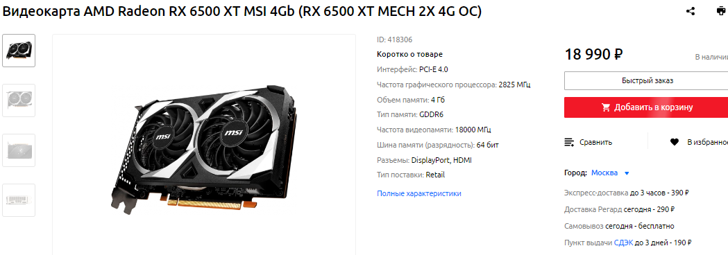 Если у вас в кармане не больше 20 тысяч рублей, то берите Radeon RX 6500 XT. По производительности карта соответствует более дорогим аналогам из зелёного лагеря, а благодаря наличию технологии FSR и вовсе можно получить куда большую скорость, чем может показаться на первый взгляд. Radeon RX 6500 XT – это настоящий гимн энергоэффективности. На рынке сегодня нет ни одной видеокарты с таким соотношением количества fps и цены. Увы, не обошлось без минусов, ведь карта ужасно себя показывает на старых ПК, где нет поддержки PCIe 4.0, но здесь уже мы поделать ничего не можем.