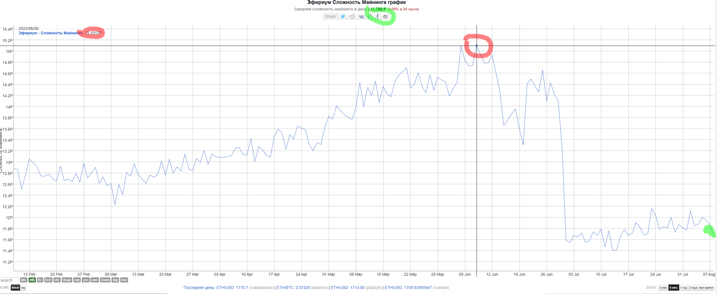 Прямо сейчас этого не случится, ведь есть сдерживающий фактор в виде перехода Эфира на PoS. Но как только сообщество найдёт эффективную замену второй по популярности криптовалюты, не исключено, что начнётся новая криптолихорадка. Когда это случится, не знают даже эксперты, ну а пока для обычных фермеров наступает неплохое время для долговременных инвестиций. Обратите внимание на график выше. Он демонстрирует сложность добычи Эфира за последние месяцы. Как видите, ещё в середине июня сложность достигала 15Р, тогда как сегодня с трудом подбирается к 12Р. В последние годы показатели сложности постоянно росли, кратковременно снизившись во время масштабного перемещения фермеров из Китая. Нет никаких сомнений, что падение хешрейта сети сыграло решающее значение в повышении выгодности добычи.
