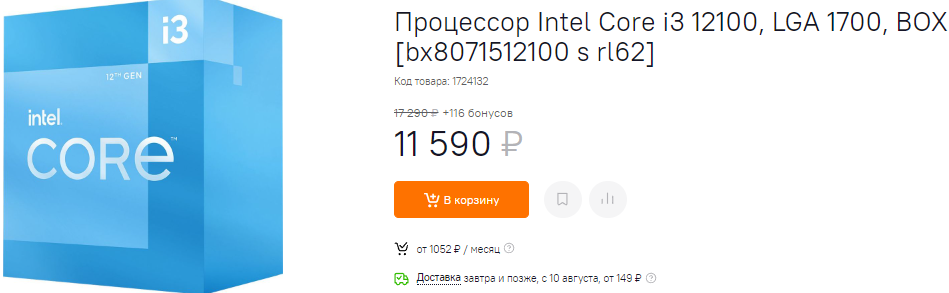 Ну и завершим на Core i3-12100. Здесь никаких сюрпризов, ведь мы уже знаем, что процессоры серии Alder Lake обладают ярко выраженными геймерскими чертами. Камень подходит для задач самого широкого круга, хотя флагманскую видеокарту мы на него всё же ставить не советовали бы, ведь будут потери в количестве кадров в секунду. Ну а для средней сборки – идеальный вариант. За 11 590 есть вариант с кулером, ну а за 9990 можно отхватить модель, в которой нет штатной системы охлаждения. Кстати, маркетологи нам пишут, что некоторое время назад этот процессор стоил на 38% дороже. Может и так.