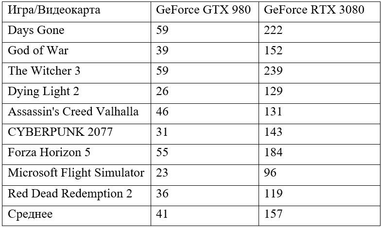 GeForce RTX 3080 вышла в 2020 году и получила 10 Гб видеопамяти. Инсайдеры уверяли, что изначально планировалось 20 Гб, а после среди энтузиастов даже мелькали графические чипы с такими характеристиками. Видеокарта получилась мощной, но довольно горячей. Спустя 6 лет за флагман просили уже 699 долларов, что на 200 вечнозелёных больше. Учтите, что мощнее GeForce GTX 980 была только одна карта GeForce GTX 980 Ti, тогда как GeForce RTX 3080 в списке на пятом месте (после GeForce RTX 3090 Ti, GeForce RTX 3090, GeForce RTX 3080 Ti, GeForce RTX 3080-12 Гб). Словом, как бы там ни было, но нам крайне интересно узнать, на что способна старушка GeForce GTX 980 спустя 8 лет после релиза. Давайте взглянем в таблицу. Разрешение установлено на 1080р, настройки графики – максимальные.