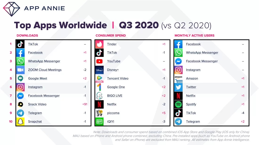 Среди категорий приложений лидируют развлечения, социальные сети и мессенджеры. Чаще всего скачивали TikTok, следом располагаются Facebook, WhatsApp и Zoom. По количеству ежемесячно активных пользователей лидирует Facebook, неподалеку находятся принадлежащие этой компании приложения WhatsApp, Facebook Messenger и Instagram.