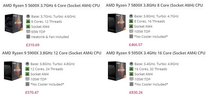 Стоимость предтоповой 12-ядерной 24-поточной модели в лице Ryzen 9 5900X с частотными характеристиками 3,8/4,8 ГГц в базовом/турборежиме и 64 Мбайт кэша L3 остановилась на отметке в ~£570.