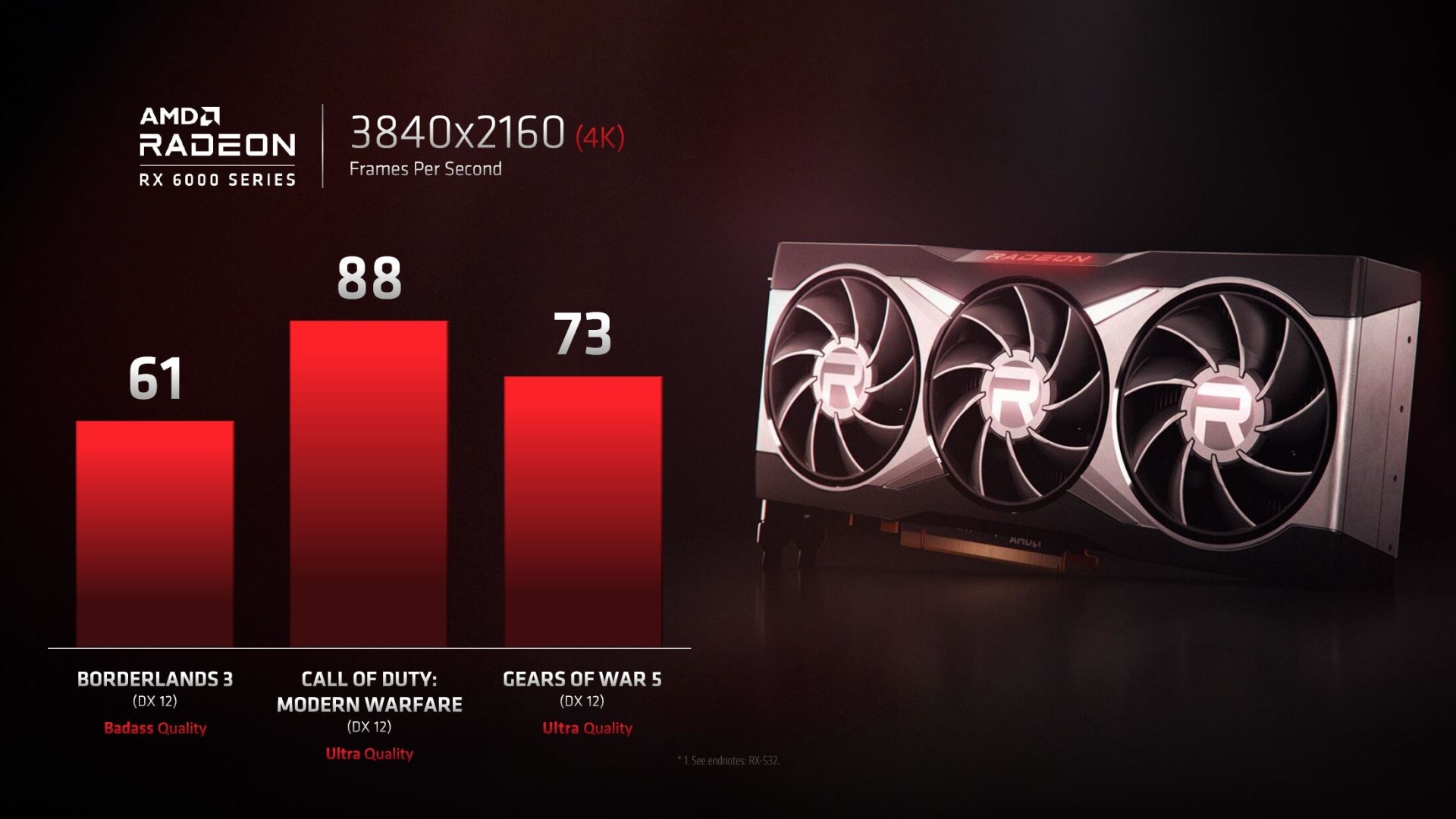 Согласно данным AMD, в игре Borderlands 3 модель серии Radeon RX 6000 смогла продемонстрировать средний результат в 61 fps — новинка оказалась быстрее GeForce RTX 2080 Ti на 45,9 %. Что касается соперничества продукта «красной команды» и недавно дебютировавшей GeForce RTX 3080, то модель от NVIDIA оказалась производительнее на 15,24 %
