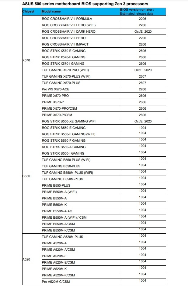 Плотная и вдохновляющая, вчерашняя презентация процессоров AMD серии Ryzen 5000 дала всем понять, что они появятся в продаже уже пятого ноября. Чтобы воспользоваться новыми процессорами, достаточно будет обновить BIOS имеющихся материнских плат, и если владельцам изделий на основе наборов логики AMD серии 400 придётся ждать до января следующего года, то платы на базе чипсетов AMD серии 500 будут готовы принять новые процессоры гораздо раньше. Например, компания Asustek Computer уже опубликовала список версий BIOS, обеспечивающих совместимость с новыми процессорами.