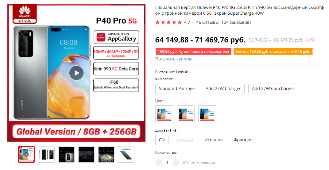 Немалую выгоду можно извлечь, не прибегая к услугам китайских площадок. Так, в Ситилинке HUAWEI P40 Pro стоит немногим больше 64 тысяч, что полностью соответствует китайской скидке. Но ведь вам не нужно платить за взнос на таможне, да и доставка будет куда быстрее. Ну и гарантия – это отдельная история, ведь в случае поломки вами придётся отправлять свой смартфон в Китай, а после ждать его, что в итоге продлится не менее двух месяцев. Давайте рассмотрим, чем настоящего ценителя флагманов может порадовать HUAWEI P40 Pro.