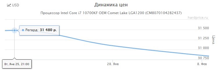 Так, десктопный процессор Intel Core i7-10700KF, наделённый 8 ядрами с поддержкой гиперпоточности и базовой частотой 3,8 ГГц с возможностью повышения вплоть до 5,1 ГГц в режиме Turbo Boost Max 3.0, но лишённый встроенной графической подсистемы, которая, впрочем, большинству покупателей данной модели не особо-то и пригодится, за последние пару недель потерял в цене почти 1600 рублей: в популярной сети компьютерных магазинов «РЕГАРД» представитель семейства Comet Lake-S доступен для покупки за 29910 рублей, хотя ещё 25 января предлагался за 31480 рублей.