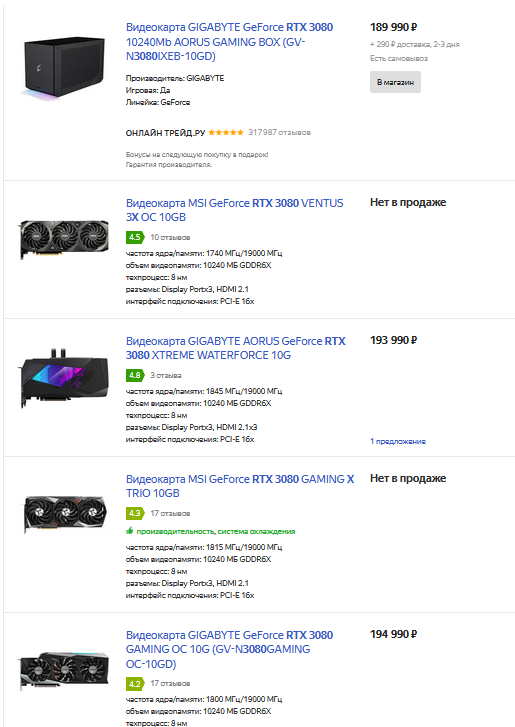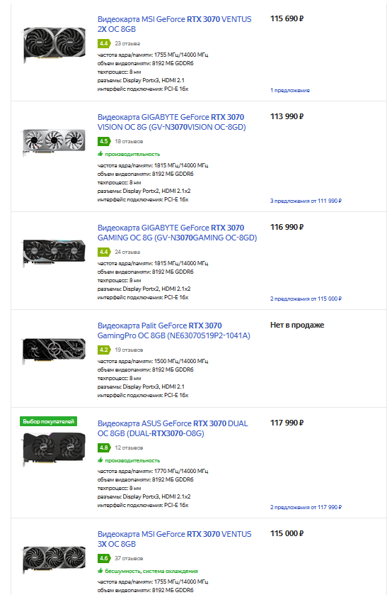 Более дешёвые RTX 3060Ti уже давно исчезли из продажи, а ценники старших моделей устремились в космос. Средняя цена предтоповой RTX 3070 находится на уровне 115 тысяч рублей, а RTX 3080 приближается к 200 000₽.