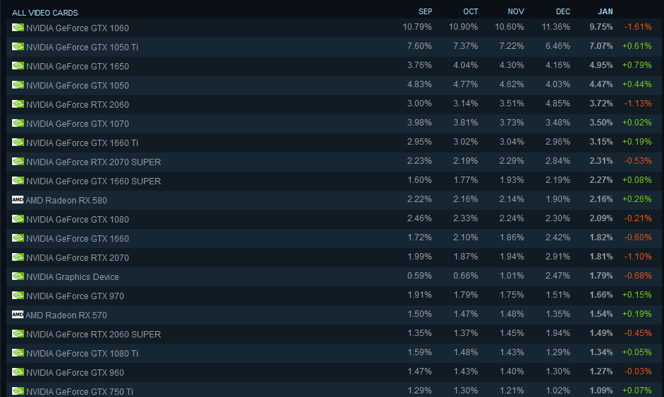 Согласно данным последнего ежемесячного отчёта Steam, значительное число пользователей сервиса выбрали в качестве новой видеокарты для своей системы морально устаревшие бюджетные видеокарты Nvidia прошлых поколений. Так, весьма посредственная GTX 1650 прибавила к своей доле 0.79%, что сделало её третьим по популярности GPU среди пользователей сервиса. Укрепила свои позиции и пара затычек GTX 1050/1050 Ti, увеличив свою долю на 0.44% и 0.61% соответственно.