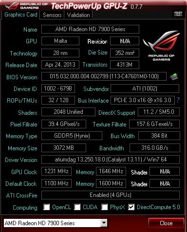 Прежде всего, заметим, что два более сильных результата получены при помощи связок из четырёх Radeon R9 290X, охлаждаемых жидким азотом. В данном же случае пара видеокарт Radeon HD 7990 довольствовалась водоблоками и частотами 1231/6584 МГц. Центральный процессор Core i7-4930K тоже оснащался водоблоком и был разогнан до 4833 МГц. В тесте Catzilla 720p удалось набрать 48 998 баллов, это единственный результат для связки из двух Radeon HD 7970 в базе данных HWBot, и третий по старшинству среди комбинаций из четырёх GPU.