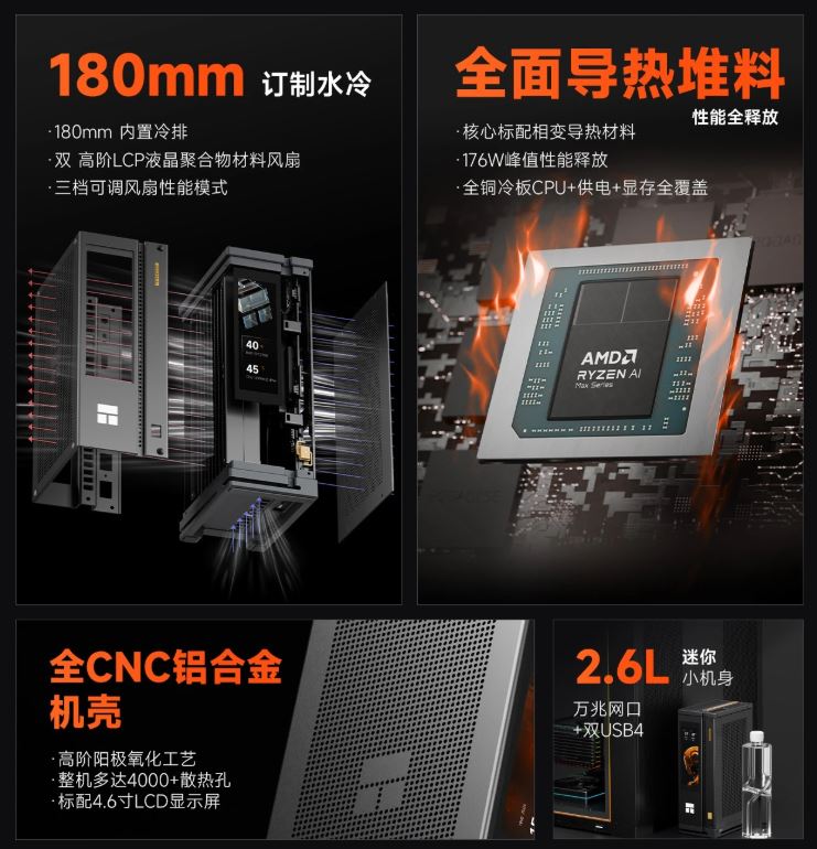 Встроенная графика Radeon 8060S позволяет запускать игры на высоких настройках. Корпус объемом 2,6 литра легко помещается в рюкзак. На передней панели установлен 4,6-дюймовый ЖК-дисплей. Он показывает параметры работы оборудования.
