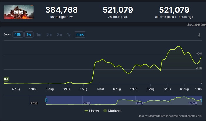 На выходных статистические результаты бета-версии Battlefield 6 предсказуемо пошли вверх. Учитывая мощный старт, максимальные результаты обещали стать поистине рекордными, и вот, так оно и произошло. Сегодня в сервисе SteamDB было зафиксировано пиковое значение количества одновременно играющих в бета-версию Battlefield 6 через Steam пользователей, равное 521 тысяче.