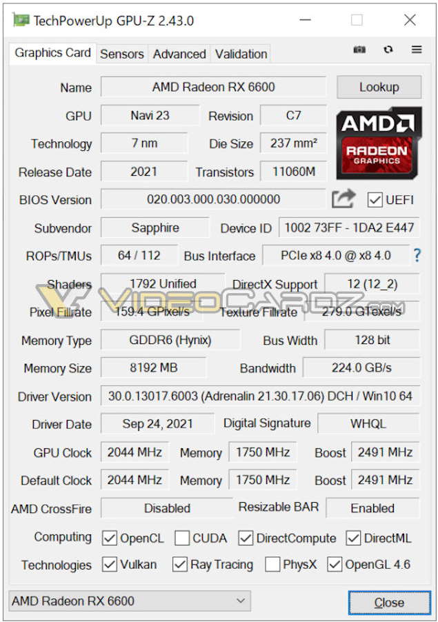 Исходя из имеющихся данных, младшая представительница архитектуры RDNA 2 в лице Radeon RX 6600 будет основана на чипе Navi 23 XL, функционирующем на частотах 2044/2491 МГц в игровом/Boost-режиме, и получит в своё распоряжение 1792 потоковых процессора, а также 8 Гбайт видеопамяти типа GDDR6 с эффективной частотой 14 ГГц. Уровень энергопотребления новинки составит 132 Вт.