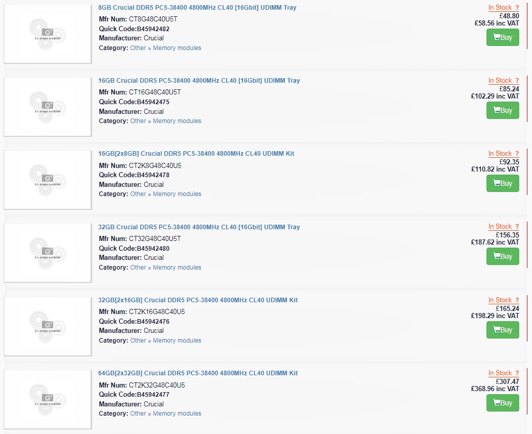 Наиболее доступным продуктом в прайс-листе ритейлера оказался модуль памяти DDR5-4800 (CL40) объёмом 8 Гбайт, оценённый в £59, набор из двух таких «планок» обойдётся в £111, модель DDR5-4800 (CL40) c 16 Гбайт «на борту» предлагается за £102, комплект из двух 16-гигабайтных модулей можно будет приобрести за £198, за «планку» DDR5-4800 (CL40) объёмом в 32 Гбайт просят £188, а за набор из пары модулей придётся выложить £369. Цены приведены с учётом налога на добавленную стоимость.