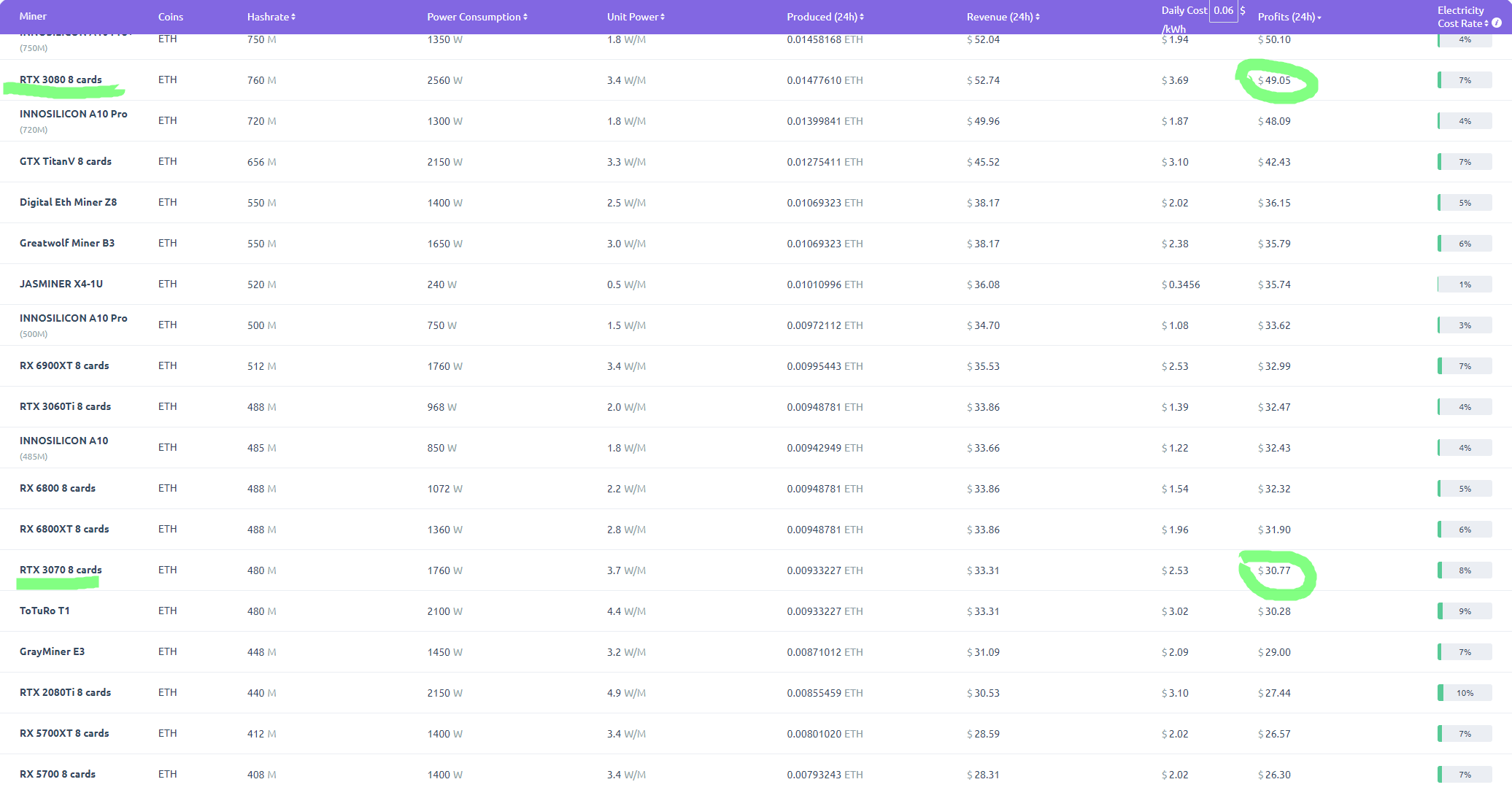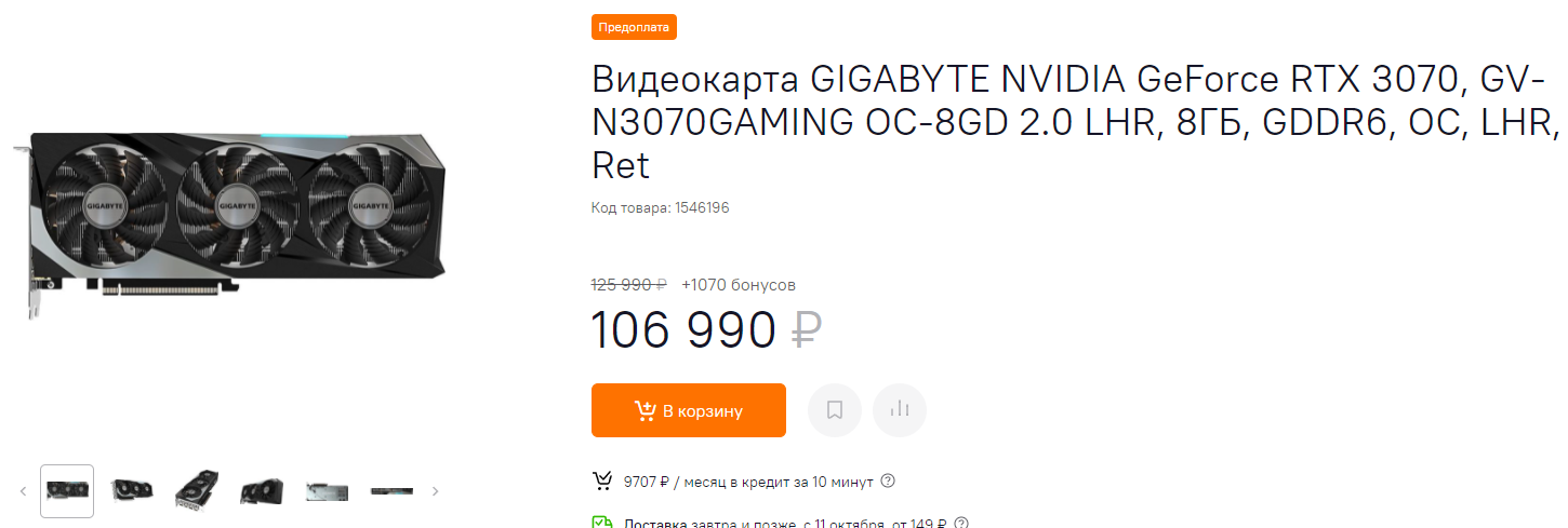 Теперь перейдём к GeForce RTX 3070. 8 видеокарт дают нам в сутки 30.77 доллара, 923 доллара в месяц и 115 долларов (8260 рублей) на одной такой карте у бюджетного майнера. Сразу вычислим из этой суммы максимальные 70%, которые можно заработать на заблокированной карте, ведь в магазинах других просто нет. Получим 5800 рублей в месяц. GIGABYTE предлагает купить GeForce RTX 3070 за 107 000 рублей, поэтому будем исходить из такой суммы для вычисления окупаемости. Получим восемнадцать с половиной месяцев. Ещё хуже, чем на GeForce RTX 3080.