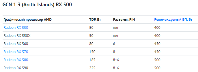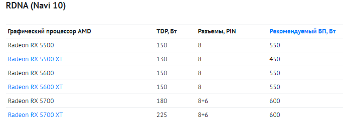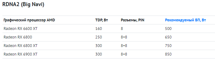 Поскольку технологические нормы постоянно улучшаются, может показаться, что в будущем снизится должны и требования по питанию. Как показала реальность, требования будут только расти. В текущем поколении AMD требовала для своих флагманов сразу два 8-контактных разъёма питания (в некоторых случаях до трёх). Это значит, что 75 Вт шло через слот PCIe x16 и до 3х150 Вт через дополнительные разъёмы. Скорее всего, ни одной из видеокарт столько не понадобится, но данное решение показывает новую тенденцию к росту мощности GPU. Ниже есть несколько любопытных таблиц, позволяющих оценить рост требований в последних поколениях.