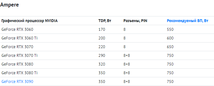 На данный момент нет графических процессоров, требующих мощности 600 Вт. Первым графическим процессором, который, по слухам, получит разъем 12VHPWR, является GeForce RTX 3090 Ti, который может потреблять до 450 Вт.