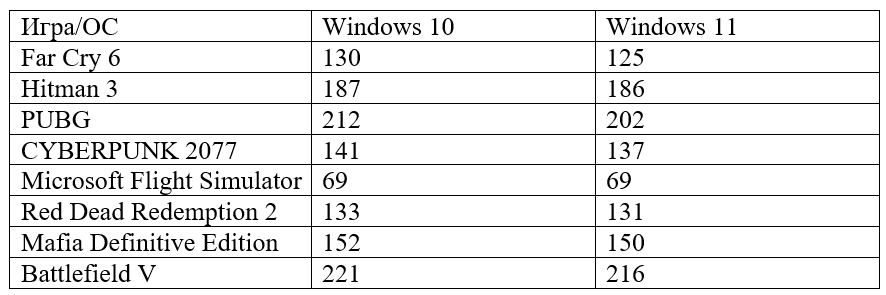 Что же, сегодня самое время понять, имеет ли смысл возмущаться владельцам процессоров AMD. Может всё не так плохо и можно уже сегодня переходить на новую операционную систему? Ну а помогут нам в этом непростом деле представители канала Testing Games. Они вооружились процессором Ryzen 9 5900X, сделав тестовые записи в нескольких играх. Отметим, что выбор процессора логичен. Ранее отмечалось, что менее всего подвержены снижению производительности 6-ядерные камни, в то время как 8-ядерные и уже тем более 12-ядерные могут терять до 15% fps. Давайте ознакомимся с результатами, систематизированными в небольшую таблицу.