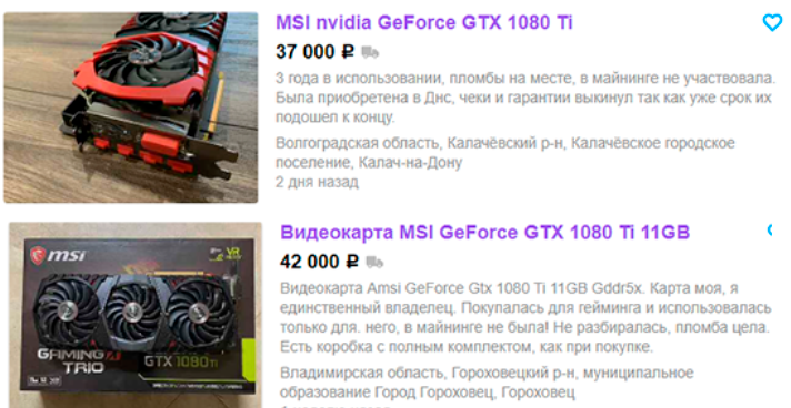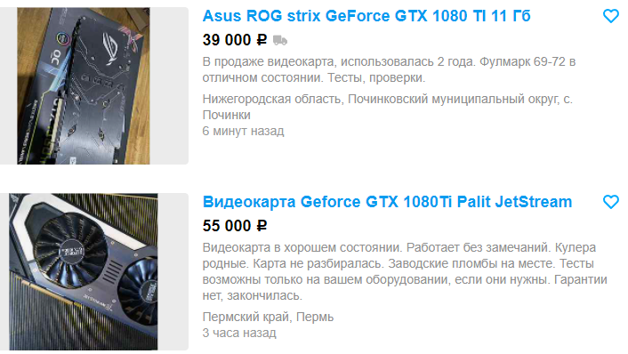 В начале октября мы отмечали, что майнеры скинули стоимость GeForce GTX 1080 Ti на 10 000 рублей. Для видеокарты за 55 000 рублей, это очень даже неплохо, но всегда может быть лучше. Как оказалось, владельцы GeForce GTX 1080 Ti активно пытаются избавиться от своих видеокарт. Ниже можно рассмотреть несколько скриншотов. Мы не делали какую-то подборку, представив несколько находящихся вверху списка новых видеокарт. Это значит, что на Авито можно встретить как более дорогие варианты, которые ещё долго будут пылиться на полках, так и совсем бюджетные варианты. Брать последние не советуем, ведь они могут иметь незначительные поломки, что в будущем приведёт к полному выходу их строя.