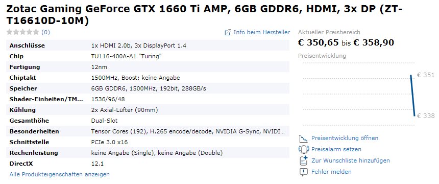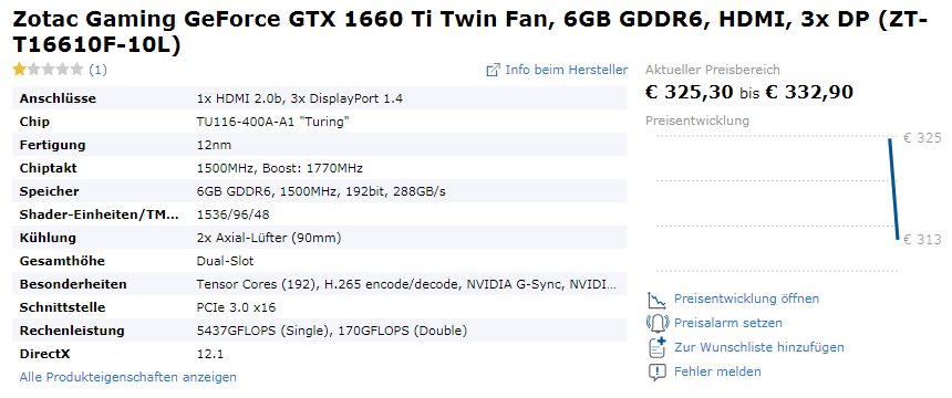Стоимость видеокарты ZOTAC Gaming GeForce GTX 1660 Ti Twin Fan варьируется от 325 до 333 евро, а за более дорогую Gaming GeForce GTX 1660 Ti AMP придётся отдать около 351-359 евро.