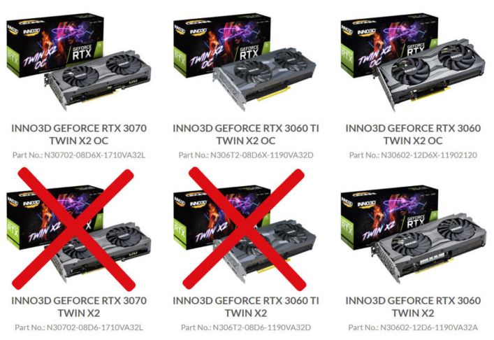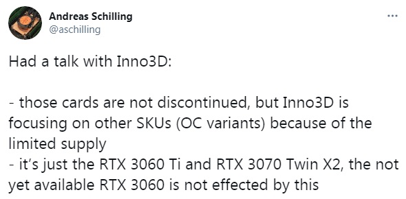 Например, как сообщает редактор сайта Hardwareluxx Андреас Шиллинг (Andreas Schilling), известная компания INNO3D решила сфокусироваться на производстве разогнанных (OC) версий видеокарт RTX 3060 Ti и RTX 3070 серии Twin X2, что спровоцировано ограниченными поставками комплектующих. Что касается более доступных моделей, то их производство не прекращено, однако, судя по всему, приостановлено.