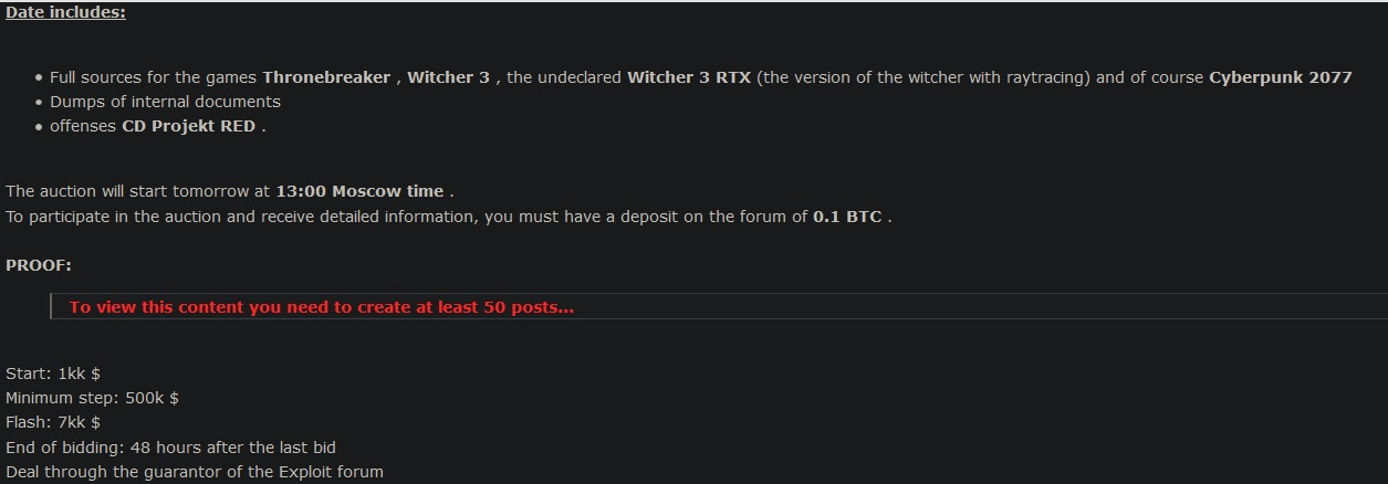 Обновлено: СМИ, сотрудники которых отслеживали в даркнете ситуацию вокруг аукциона украденных исходных кодов игр от CD Projekt RED, сообщили о том, что покупатель уже нашёлся. Его контакты, а также сумма, которую он выложил за столь ценные данные, остаются неизвестными. Ранее в Сети упоминалось о том, что минимальная установленная взломщиками ставка за исходники Cyberpunk 2077, The Witcher 3 для «некстгена», а также Thronebreaker и «Гвинта» составляла миллион долларов.