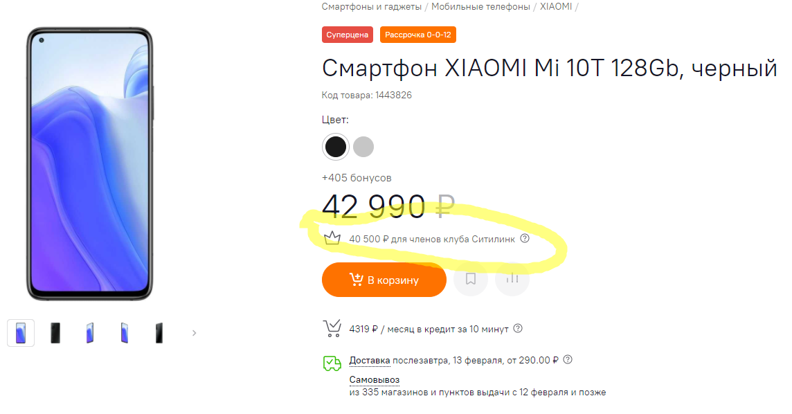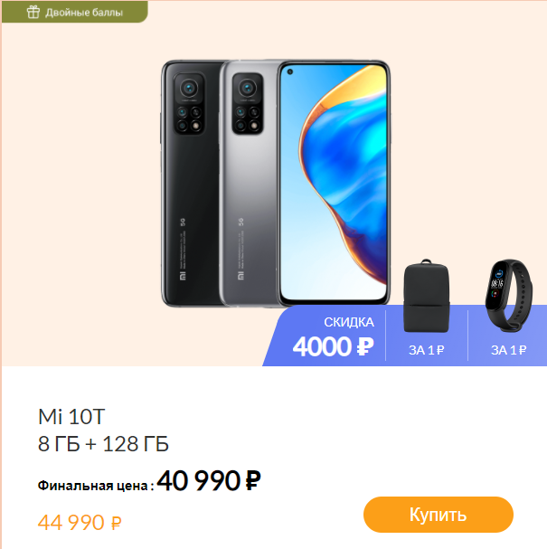 В настоящее время официальный ритейлер Xiaomi в РФ предоставляет скидку на данный аппарат в размере 4000 рублей, плюс подарочек более чем на 4 тысячи в виде браслета Mi Smart Band 5. Увы, акция не вечна, а наши читатели могут зайти на несколько дней позднее. В любом случае должен быть выбор. Так, в Ситилинк Mi 10T можно купить за 42 990, что ниже официальной цены, но для постоянных покупателей приготовлены скидки, что позволяет стать владельцем продвинутого флагмана за 40 500 рублей, что на 440 рублей дешевле, чем предлагает официальный магазин.