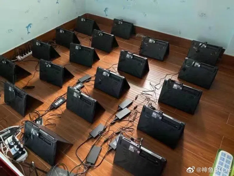 Речь идёт не об единичных случаях, а о полноценных майнинг-фермах, где ноутбуки уже вовлечены в процесс, а для более эффективного охлаждения установлены в форме палатки.