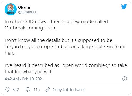 Эта информация исходит от авторитетного инсайдера Call of Duty Оками, который говорит, что слышал, что этот новый режим описывается как режим «Зомби в открытом мире». «Не знаю всех деталей, но это должно быть в стиле Treyarch, зомби-кооперативы на крупномасштабной карте Fireteam», - пишет инсайдер в Twitter.