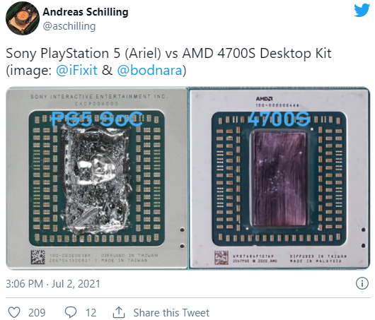 Что касается сходства с консолью PlayStation 5, то в AMD ответили, что настольный комплект 4700S является уникальной разработкой для удовлетворения потребностей массового рынка в производительных процессорах с большим количеством ядер. Однако, сходство AMD 4700S и PS5 нельзя отрицать. В связи с этим появилось мнение, что комплекты AMD 4700S являются отбраковками предназначенных для PS5 процессоров, в которых не функционирует графическая часть чипа.