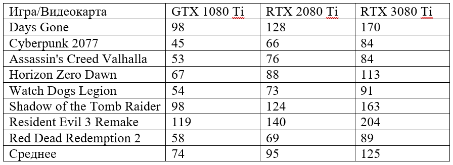 Что же, проблема актуальности старых флагманов сегодня актуальна как никогда. Уж простите за тавтологию, но точнее и не скажешь. С целью выяснить потенциал самых быстрых видеокарт прошлых поколений, ребята с канала Benchmark провели тестирование следующих видеокарт в наиболее актуальных играх: GeForce RTX 3080 Ti; GeForce RTX 2080 Ti; GeForce GTX 1080 Ti. Результаты отражены в таблице. В качестве процессора использовался 8-ядерный Core i7-10700K, количество памяти было зафиксировано на уровне 32 Гб (две планки по 16 Гб). Разрешение дисплея установлено на отметку 2К на высоких настройках графики. Внимательно изучите средние показатели по каждой видеокартам, а после перейдём к выводам.