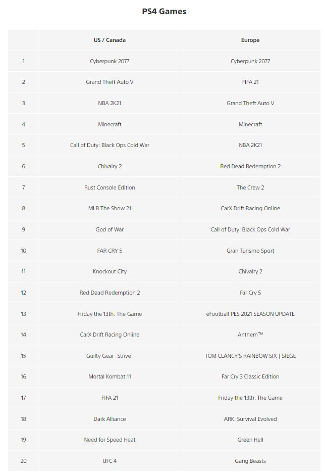 PS4: Первое место как в Европе, так и в США/Канаде заняла отличная сюжетная игра от польских разработчиков — Cyberpunk 2077. Второе место в Европе занял симулятор футбола FIFA 21, а в Америке — легендарная Grand Theft Auto V. Третье место в Америке занял симулятор баскетбола NBA 2k21, а вот в Европейском регионе третье место получила опять Grand Theft Auto V (видимо ее загрузки никогда не упадут). Четвертое место заняла песочница Minecraft в обоих регионах. В США пятое место взяла Call Of Duty: Black Ops Cold War, а в Европе — NBA 2k21.