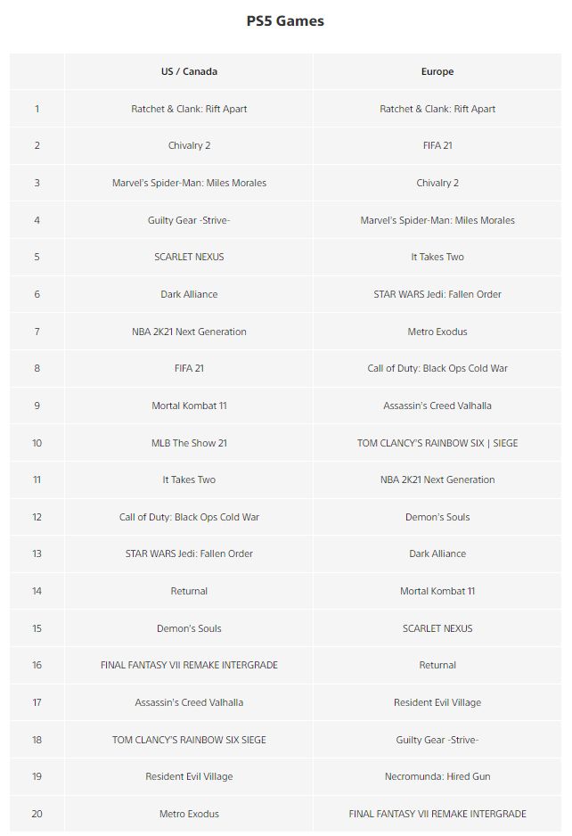 PS5: первое место заняла Ratchet & Clank: Rift Apart, и сразу в обоих регионах. Следом в американском регионе идёт Chivalry 2, а в Европейском FIFA 21. На третьем в Европе теперь стоит Chivalry 2, а в Америке — в который раз Spider-Man: Miles Morales.
