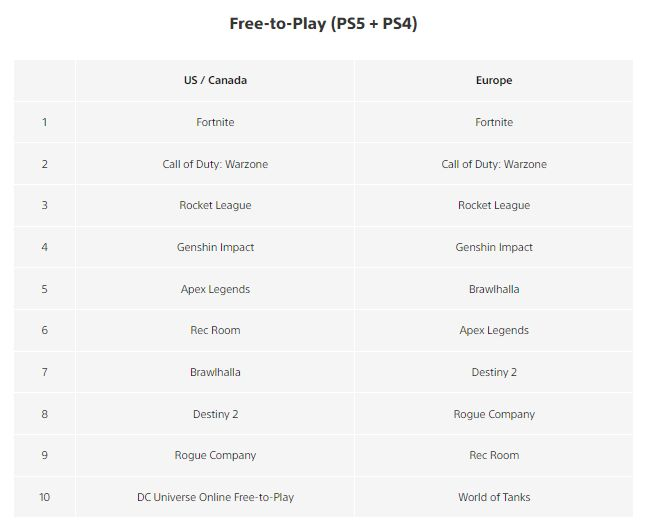 Топ Free-to-play (PS4+PS5): на первом месте в обоих регионах находится Fortnite, а на втором Call Of Duty: Warzone (также в обоих). На третьем месте Rocket League, и какое удивление, опять в обоих регионах!