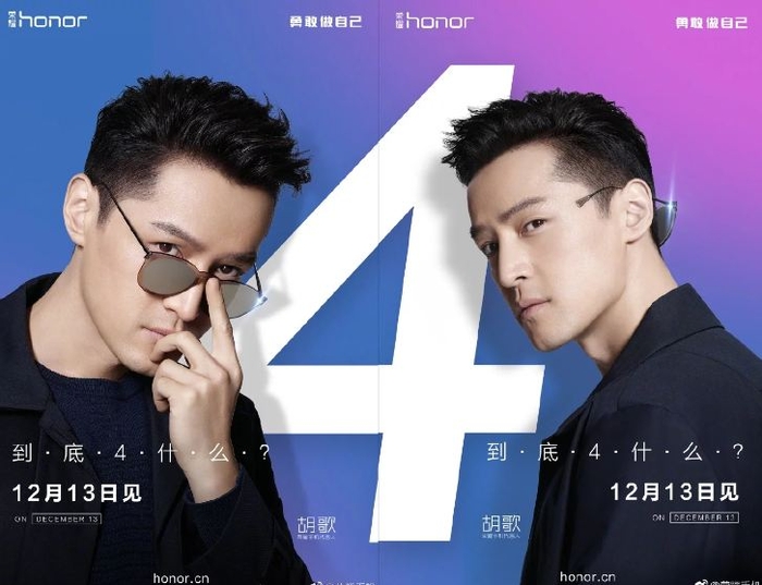 На одном из плакатов запечатлён популярный китайский певец и актёр Ху Гэ (Hu Ge) в солнцезащитных очках, он же и на другом плакате, только очки у него находится уже на затылке. Это, а также изображение цифры 4, можно расценить как намёк на то, что новый смартфон получит две двойные камеры: основную и фронтальную. Кстати, у Huawei уже есть смартфон с двойной основной и двойной фронтальной камерами. Это Huawei Maimang 6, известный также как Honor 9i, Nova 2i и Mate 10 Lite.