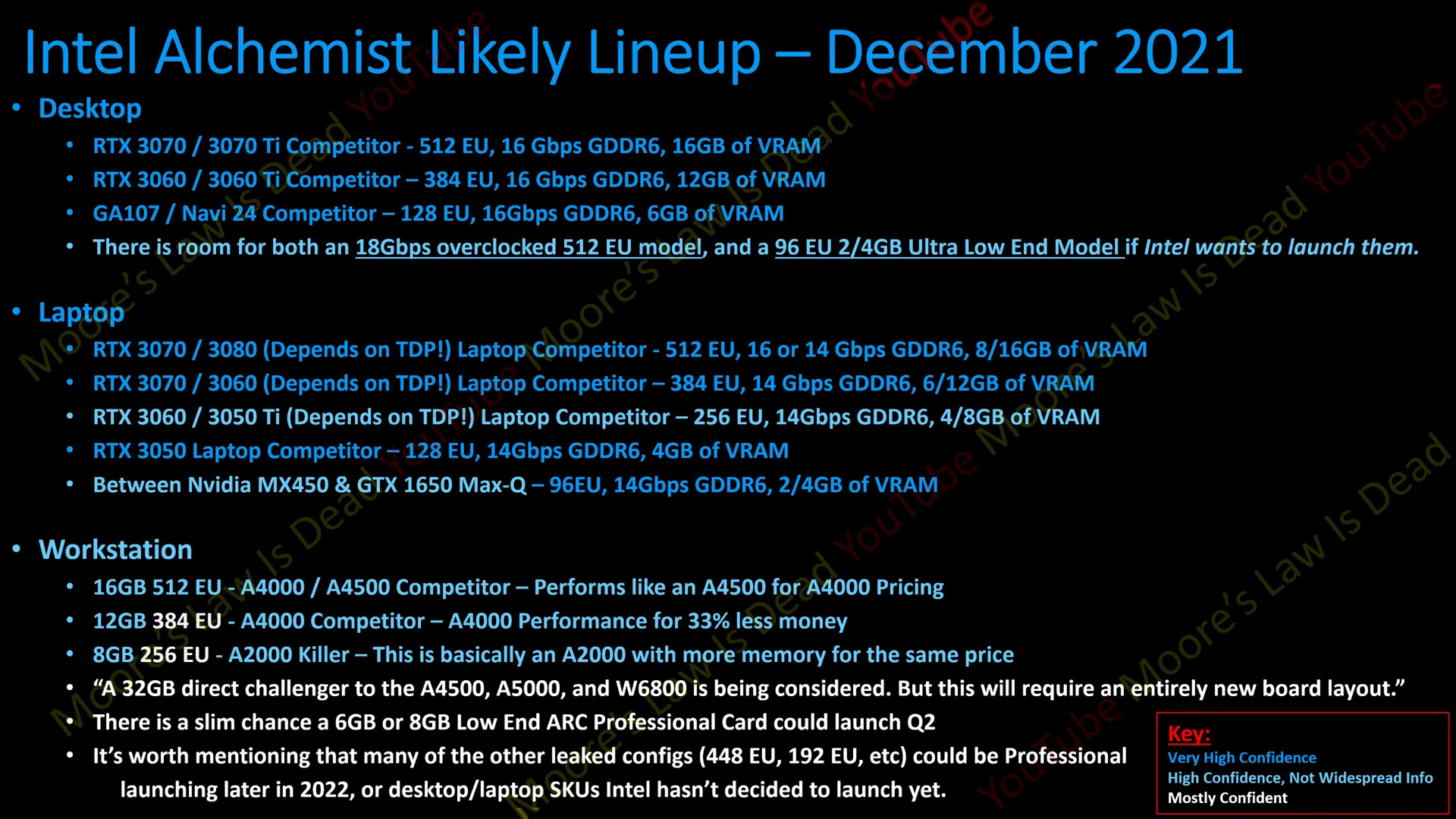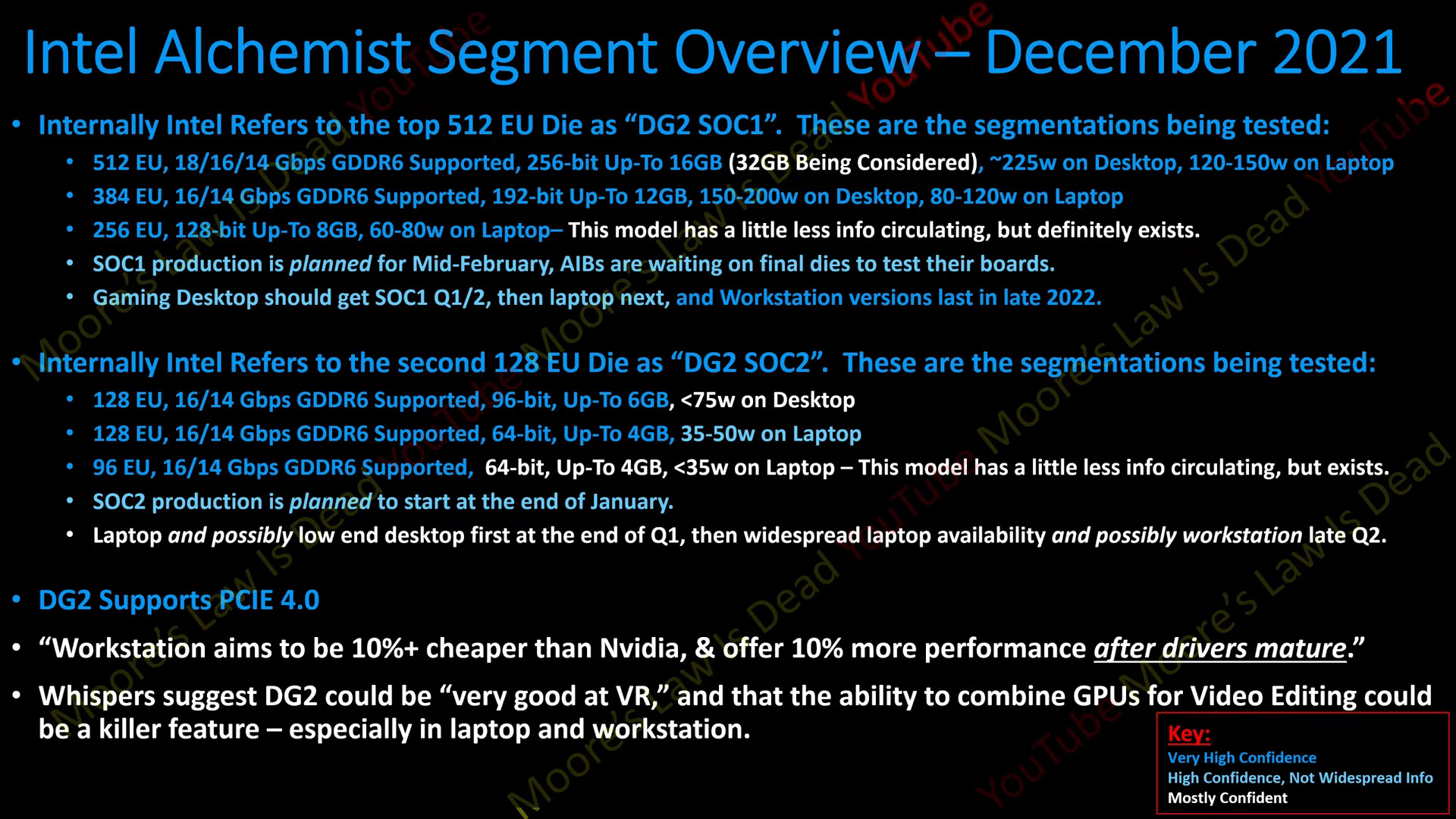 В очередном видео на своем YouTube канале инсайдер Moore’s Law Is Dead (далее MLID) собрал воедино всю известную информацию о будущих дискретных видеокартах Intel Arc Alchemist, дополнив ее самыми свежими данными. Итак, по данным инсайдера, Intel разработала два графических процессора, большой SOC1 и малый SOC2, с максимальным количеством исполнительных блоков Execution Units (EU) 512 и 128 соответственно. Всего тестируется шесть конфигураций графических процессоров для будущих видеокарт, по три на каждый SOC: