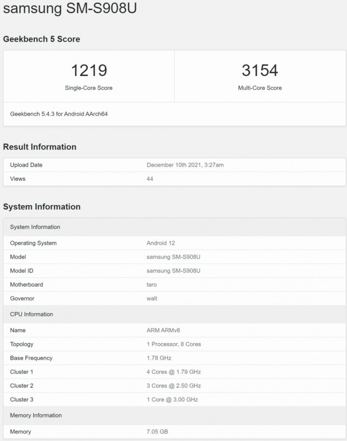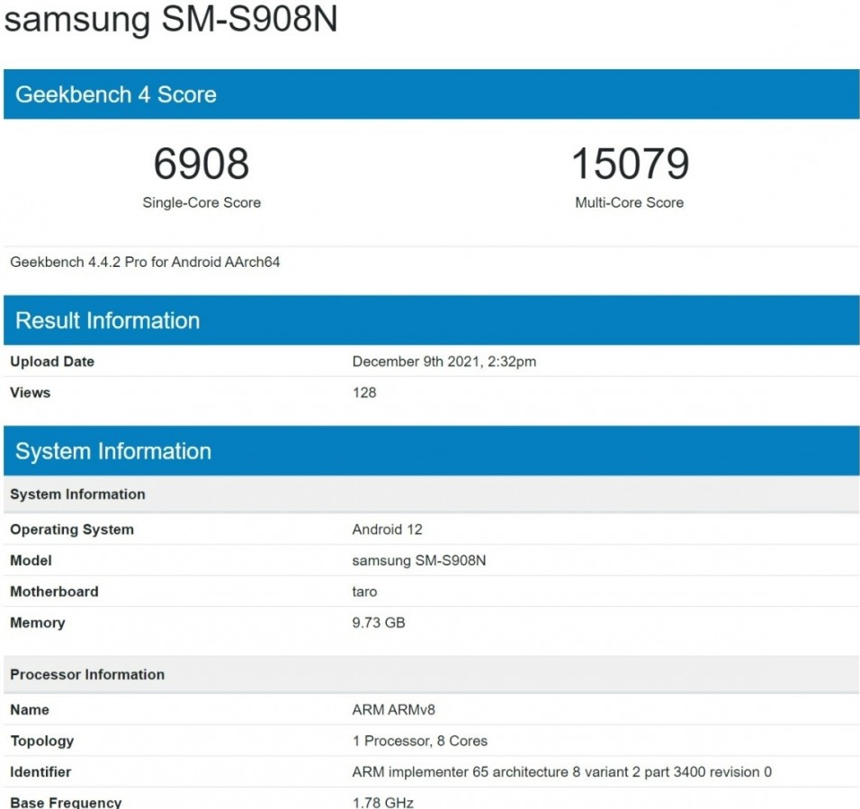 Samsung Galaxy S22 Ultra был замечен на Geekbench в прошлом месяце с обозначением модели SM-S908B на чипе Exynos 2200 SoC и с 8 ГБ оперативной памяти. Теперь вариант с процессором Snapdragon 8 Gen 1 также появился в базе данных тестов с кодом модели SM-S908N и SM-S908U. Первый, вероятно, является корейской версией, а второй может быть вариантом для США.
