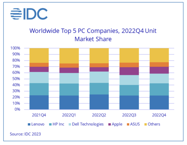 Кто-то пострадал больше, кто-то меньше. Три бренда: Lenovo, HP и Dell, увидели снижение на 29-37% в конце 2022 года относительно предыдущего. По информации Gartner, Acer понес ошеломляющие потери в 41%. Apple, занимающая четвертое место, получила относительно легкий удар, хотя это все равно неприятно, её поставки упали на целых 10 процентов.