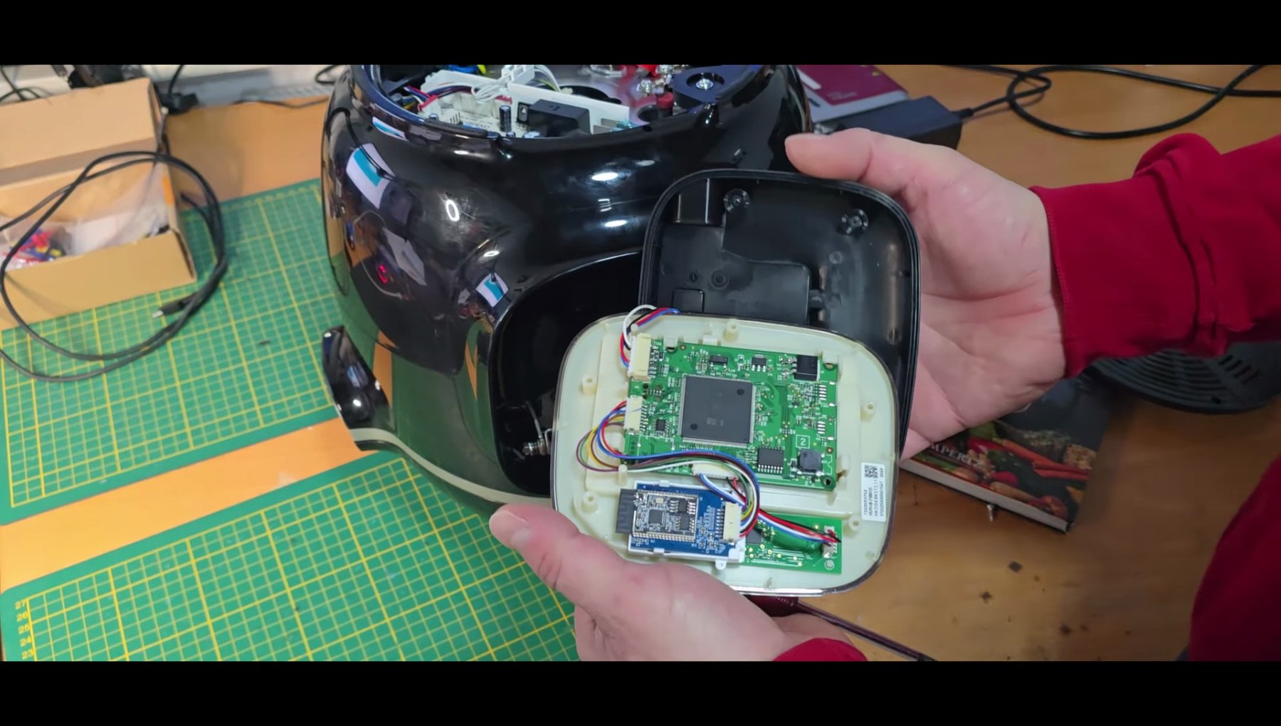 Моддер решил запустить Doom на своей умной скороварке Krups Cook4Me, для чего он разобрал устройство, обнаружив в нём простенькую плату, отвечающую непосредственно за нагрев и регулирование температуры, и более мощный чип Renesas R7S721031V совместно с модулем Wi-Fi, 128 МБ оперативной и 128 МБ постоянной памяти, а также рядом других элементов, расположенных за сенсорным дисплеем в боковом блоке.